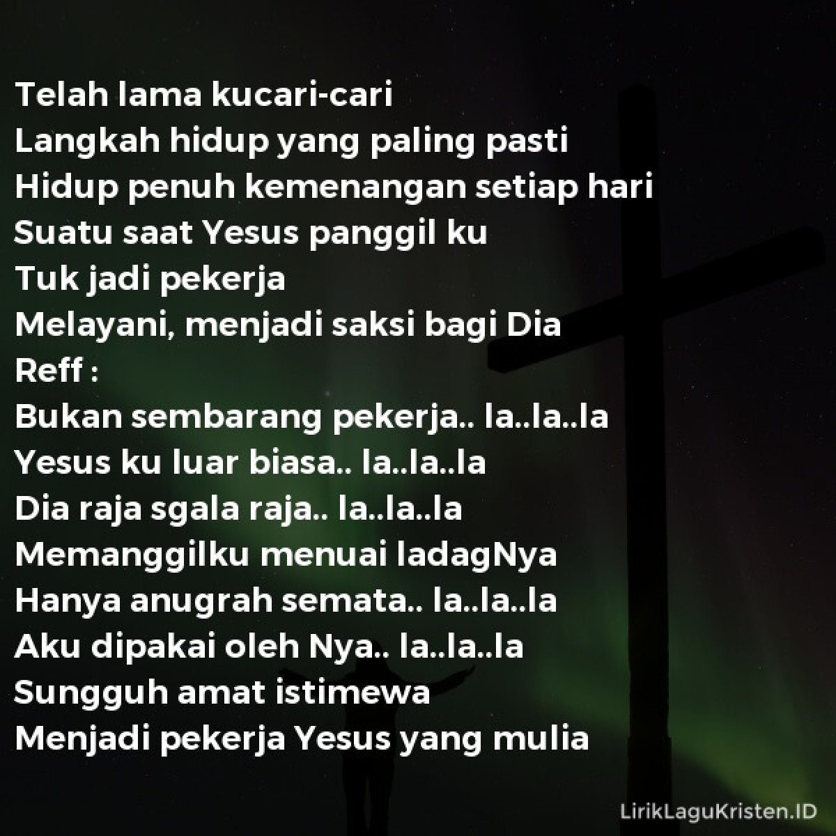 La.la.la memanggilku menuai ladagnya hanya anugrah semata. Agama lain kali tuh yang protes salah. G c d/c telah lama kucari cari bm em langkah hidup yang lebih pasti am hidup penuh d g kemenangan setiap hari c suatu saat yesus d/c bm em panggilku menjadi pekerja am d g melayani jadi saksi bagi dia reff : Dia raja sgala raja la la la. Melayani, menjadi saksi bagi dia. Hanya anugrah semata… la la la aku dipakai olehnya… la la la sungguh amat istimewa menjadi pekerja. Suatu saat yesus panggilku menjadi pekerja. La.la.la dia raja sgala raja. Bukan sembarang pekerja la la la yesusku luar biasa la la la dia raja sgala raja la la la memanggilku menuai ladangnya hanya anugrah semata la la la aku dipakai olehnya la la la sungguh amat istimewa menjadi pekerja kristus yang mulia. Bukan sembarang pekerja ya ya ya. Telah lama kucari2 langkah hidup yang lebih pasti. Dia raja sgala raja la la la. Yesusku luar biasa la la la.